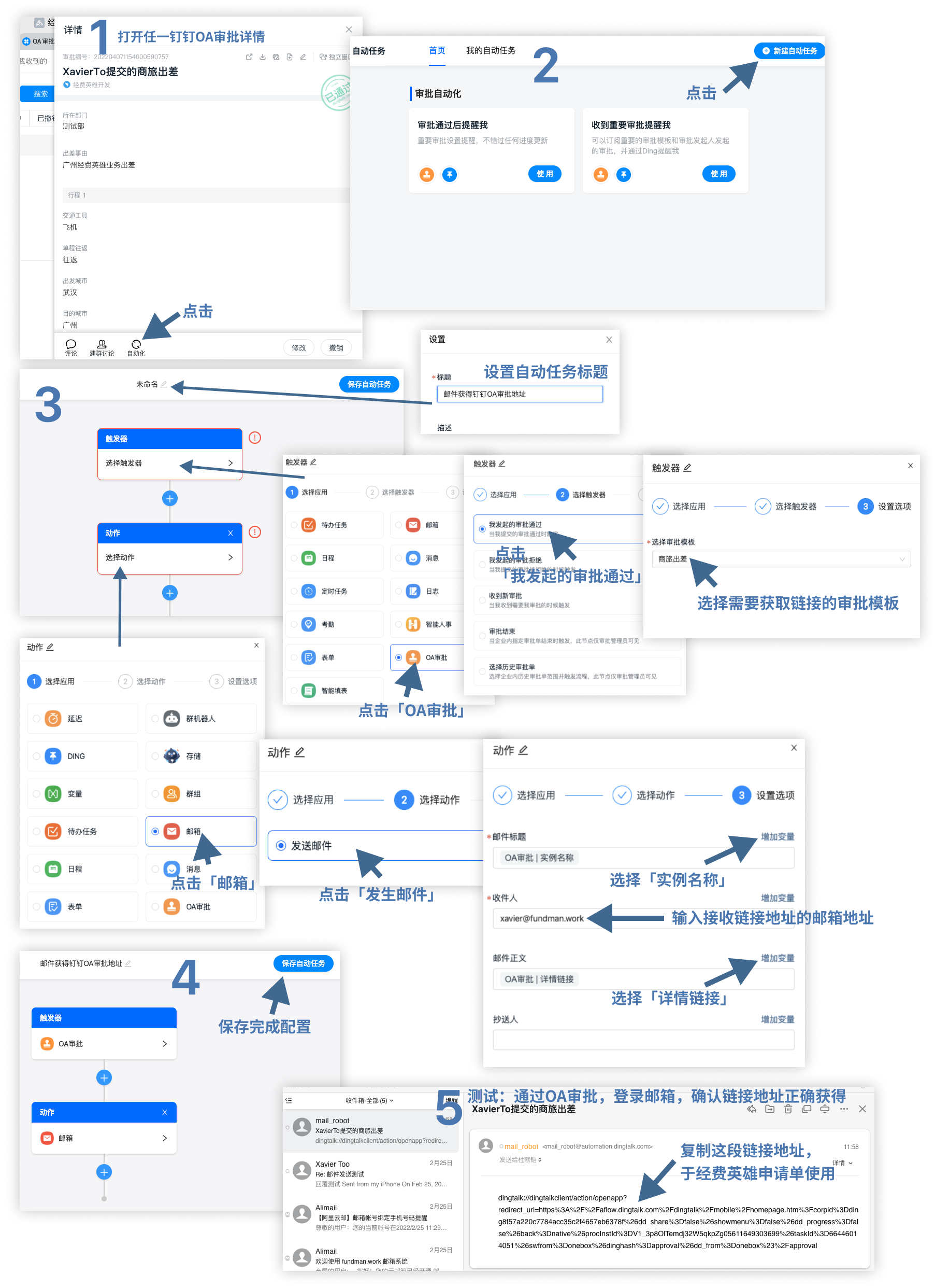 申请者配置钉钉OA审批的「自动化」任务功能,让审批通过后触发自动任务将包含有审批单链接的「电子邮件」或「DING」将发送给申请者,以便在关联申请单时使用。