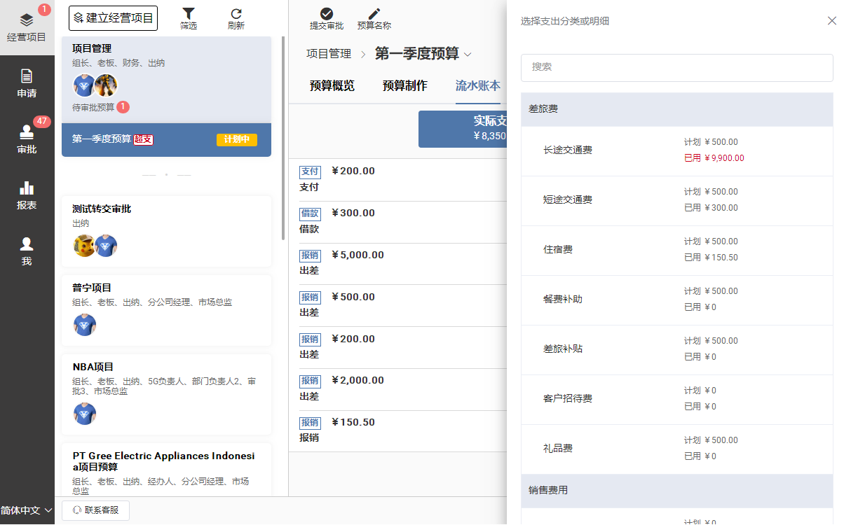 - 项目报表:查看整个项目,下属预算合并统计分析